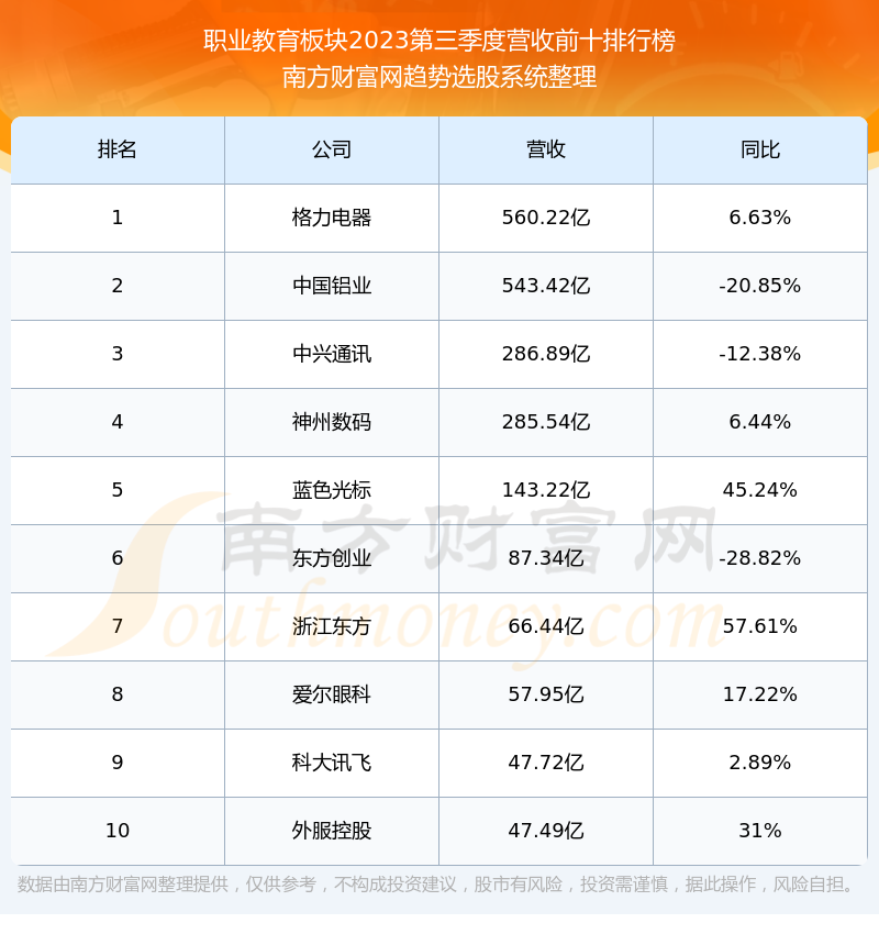 按照南方财富网趋势选股系统统计,该股所属板块为职业教育板块,该板块共有106只股票,中国高科2023第三季度营收在该板块中排名为第103名,该板块2023第三季度营收排名前十的股票如下表: