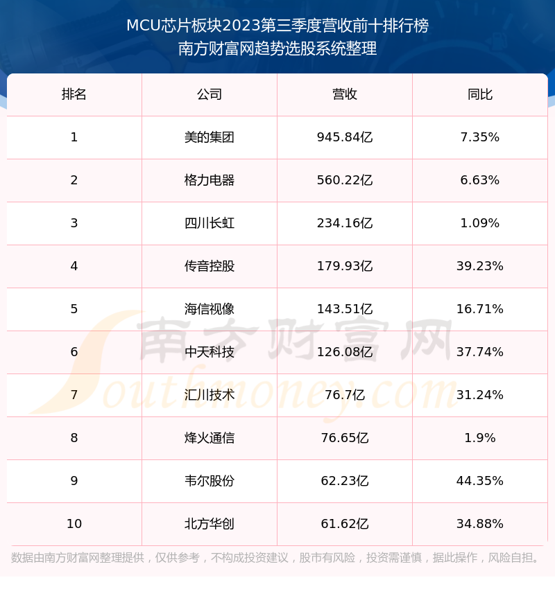 按照南方财富网趋势选股系统统计,该股所属板块为MCU芯片板块,该板块共有79只股票,芯海科技2023第三季度营收在该板块中排名为第74名,该板块2023第三季度营收排名前十的股票如下表: