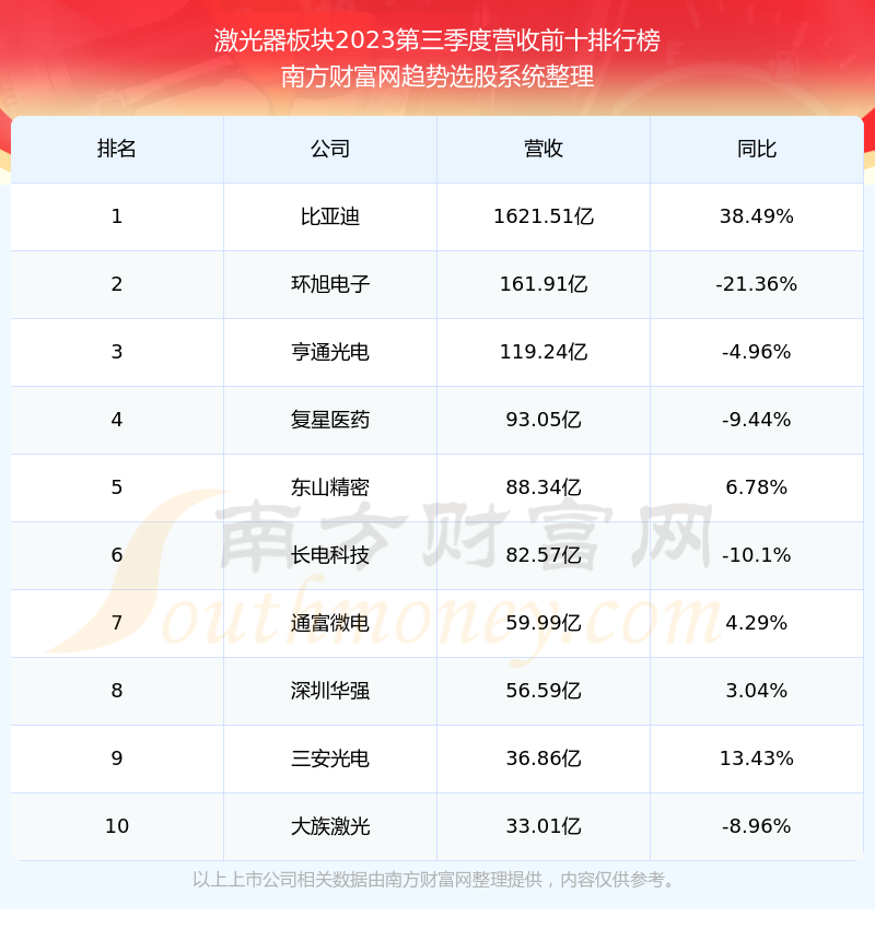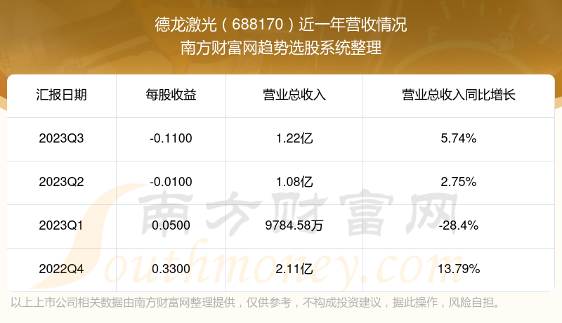 按照南方财富网趋势选股系统统计,该股所属板块为激光器板块,该板块共有58只股票,德龙激光2023第三季度营收在该板块中排名为第53名,该板块2023第三季度营收排名前十的股票如下表: