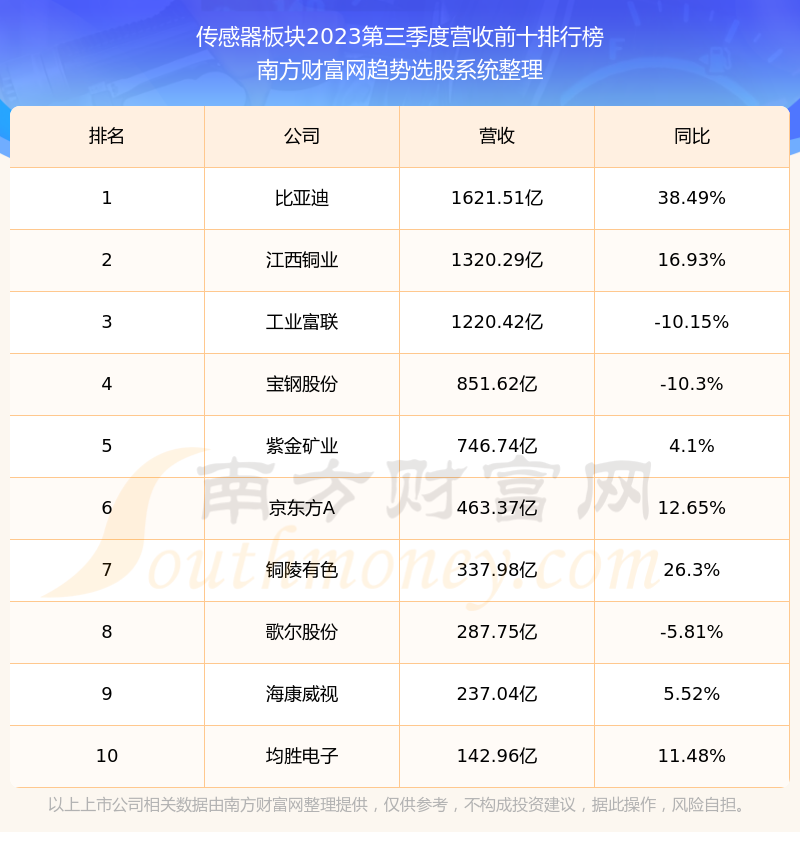 按照南方财富网趋势选股系统统计,该股所属板块为传感器板块,该板块共有189只股票,四方光电2023第三季度营收在该板块中排名为第149名,该板块2023第三季度营收排名前十的股票如下表: