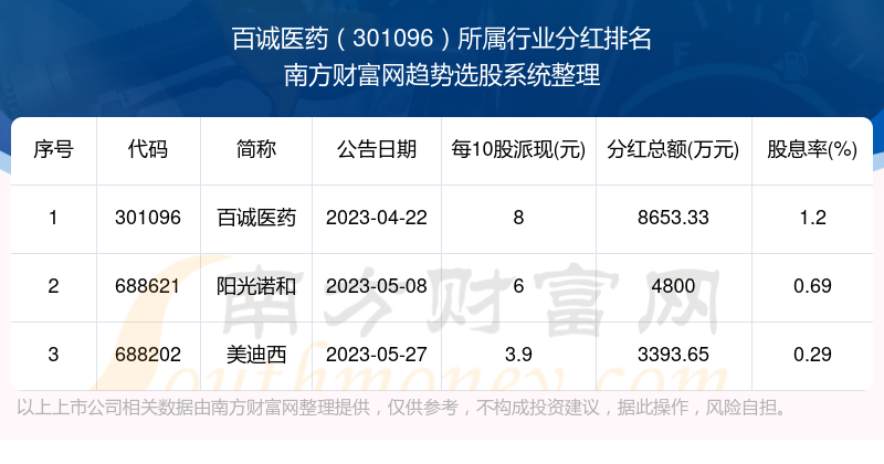 按照南方财富网趋势选股系统统计,百诚医药所属行业为药学研究行业,药学研究行业分红排名情况如下表: