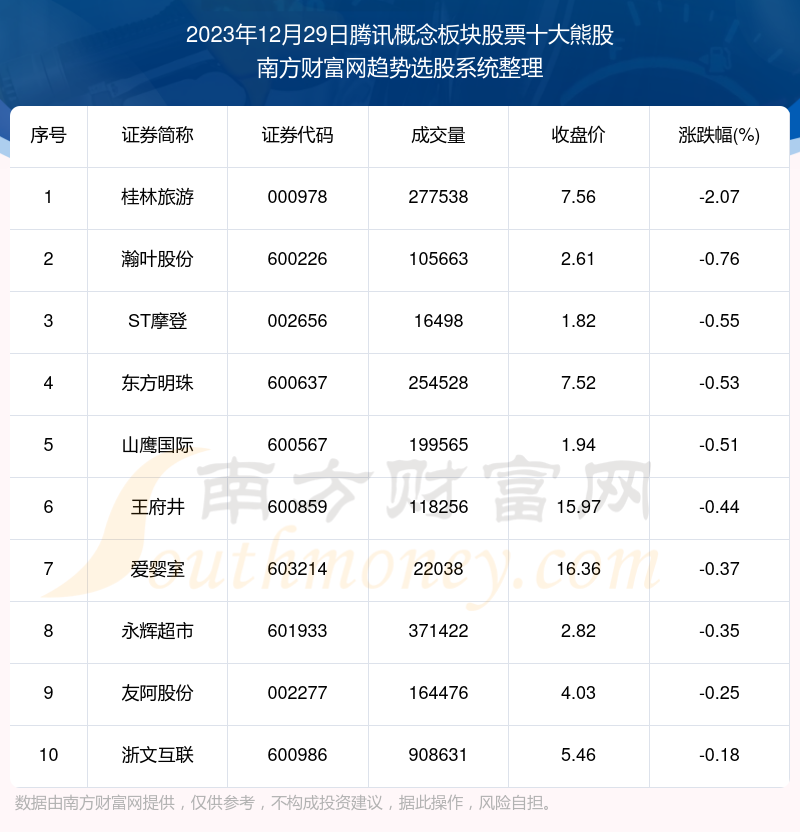 截止2023年12月29日,个股表现方面,腾讯概念板块股票当日领跌股为桂林旅游(000978),该股当日报收7.56,上涨-2.07%,成交量27.75万。瀚叶股份(600226)以下跌-0.76%紧随其后,该股当日成交量10.57万。此外,ST摩登(002656)、东方明珠(600637)、山鹰国际(600567)均进入当日腾讯概念板块股票熊股之列。