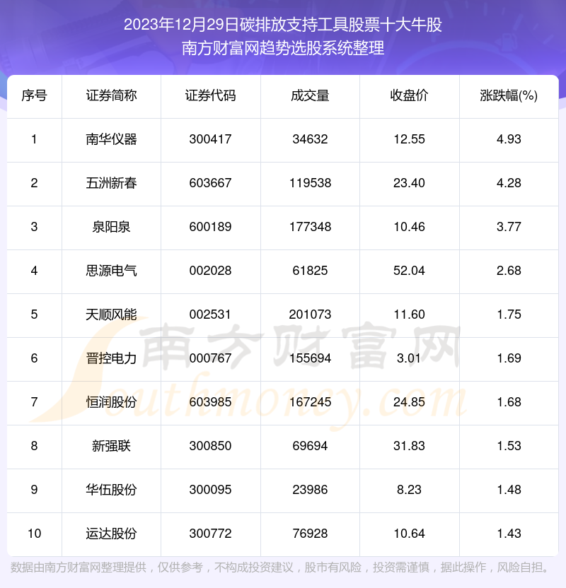 截止2023年12月29日,个股表现方面,碳排放支持工具股票当日领涨股为南华仪器(300417),该股当日报收12.55,上涨4.93%,成交量3.46万。五洲新春(603667)以上涨4.28%紧随其后,该股当日成交量11.95万。此外,泉阳泉(600189)、思源电气(002028)、天顺风能(002531)均进入当日碳排放支持工具股票牛股之列。