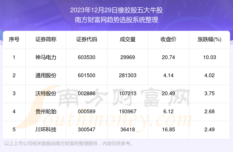 截止2023年12月29日,个股表现方面,橡胶股当日领涨股为神马电力(603530),该股当日报收20.74,上涨10.03%,成交量3万。通用股份(601500)以上涨4.02%紧随其后,该股当日成交量28.13万。此外,沃特股份(002886)、贵州轮胎(000589)、川环科技(300547)均进入当日橡胶股牛股之列。