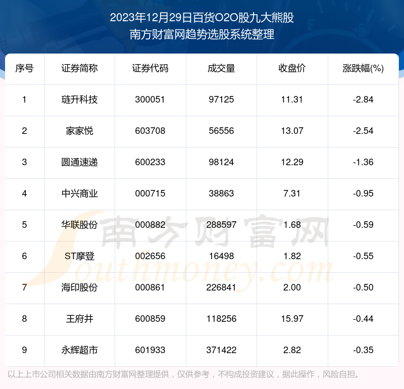 截止2023年12月29日,个股表现方面,百货O2O股当日领跌股为琏升科技(300051),该股当日报收11.31,上涨-2.84%,成交量9.71万。家家悦(603708)以下跌-2.54%紧随其后,该股当日成交量5.66万。此外,圆通速递(600233)、中兴商业(000715)、华联股份(000882)均进入当日百货O2O股熊股之列。