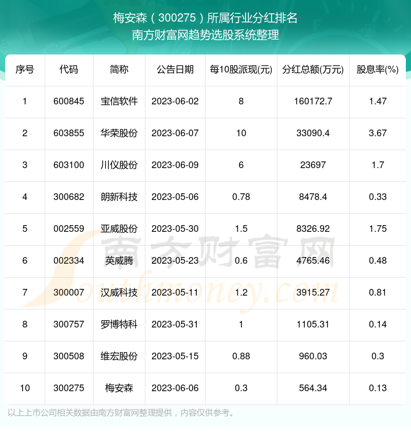 二、梅安森300275行业分红排名