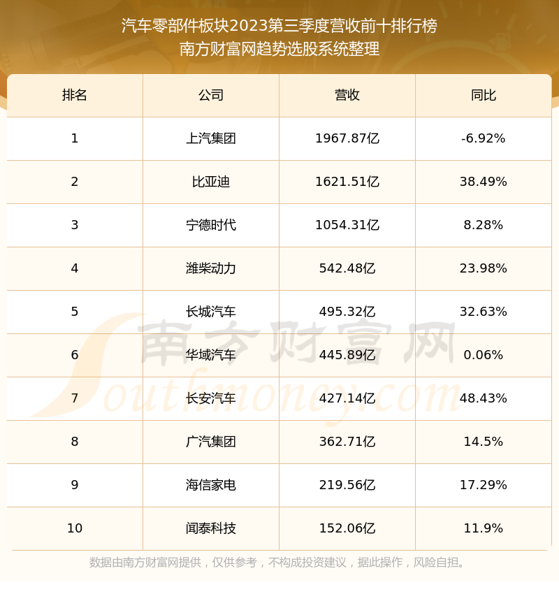 按照南方财富网趋势选股系统统计,该股所属板块为汽车零部件板块,该板块共有468只股票,朗博科技2023第三季度营收在该板块中排名为第462名,该板块2023第三季度营收排名前十的股票如下表: