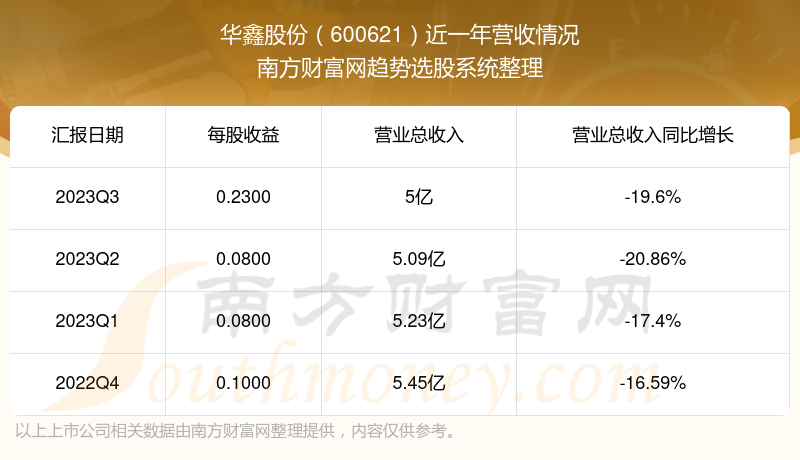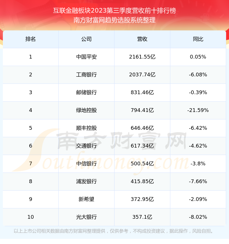 按照南方财富网趋势选股系统统计,该股所属板块为互联金融板块,该板块共有238只股票,华鑫股份2023第三季度营收在该板块中排名为第238名,该板块2023第三季度营收排名前十的股票如下表: