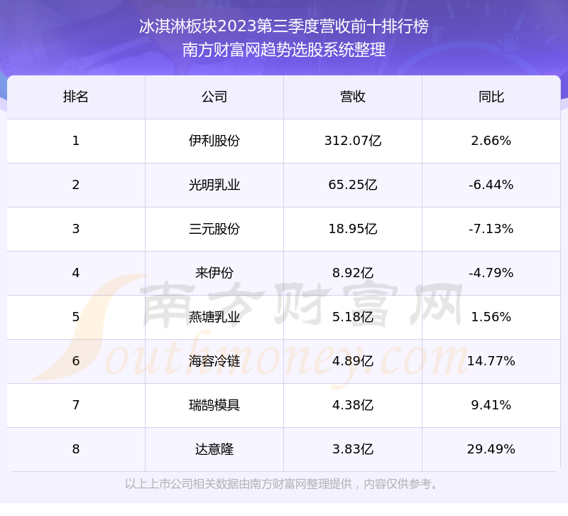 按照南方财富网趋势选股系统统计,该股所属板块为冰淇淋板块,该板块共有8只股票,三元股份2023第三季度营收在该板块中排名为第3名,该板块2023第三季度营收排名前十的股票如下表: