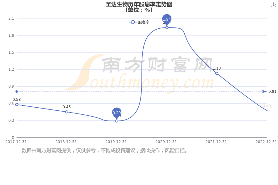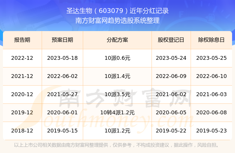 圣达生物最新一次公布的分红方案为10派0.6元。本次权益分派股权登记日为2023年5月24日,除权除息日为2023年5月25日,派息日为2023年5月25日。