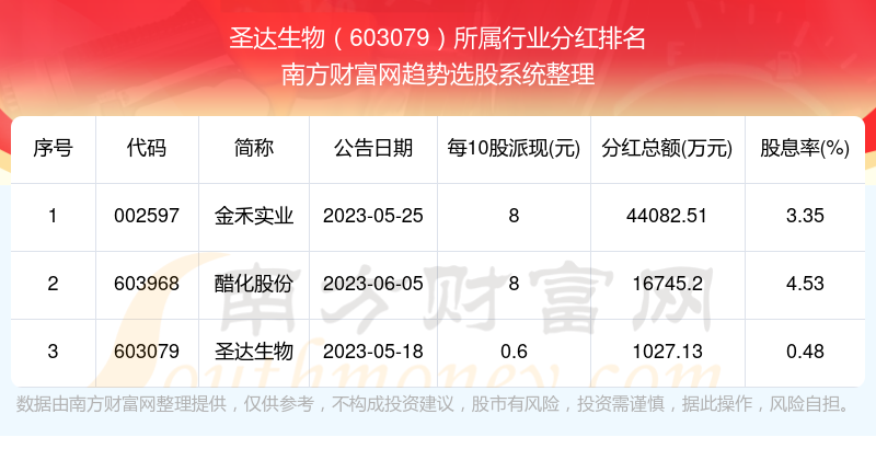 按照南方财富网趋势选股系统统计,圣达生物所属行业为食品添加剂行业,食品添加剂行业分红排名情况如下表: