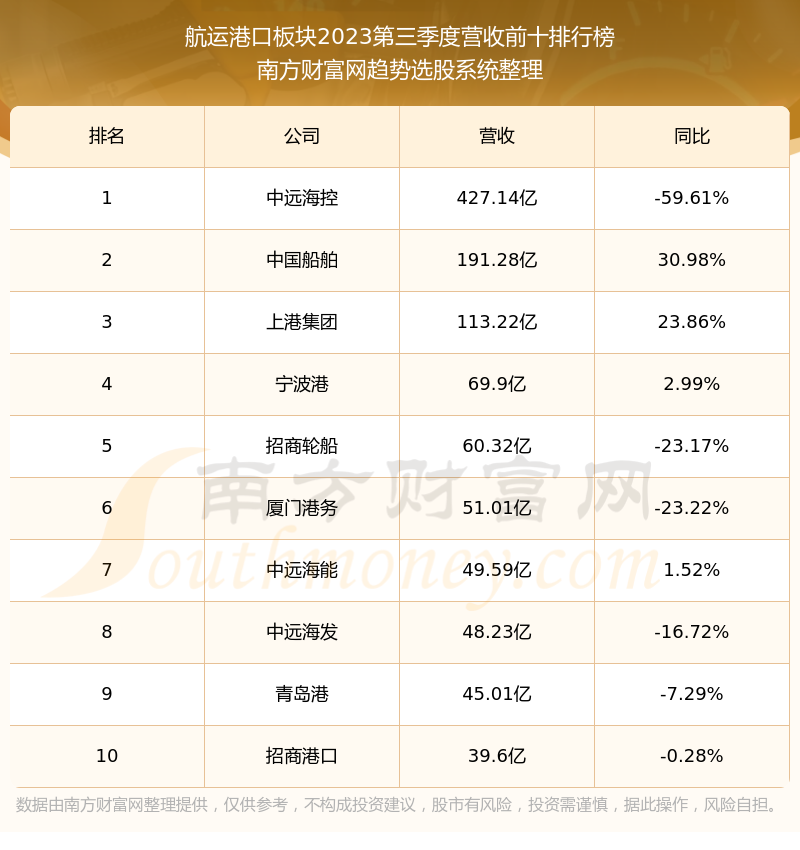 按照南方财富网趋势选股系统统计,该股所属板块为航运港口板块,该板块共有25只股票,日照港2023第三季度营收在该板块中排名为第25名,该板块2023第三季度营收排名前十的股票如下表: