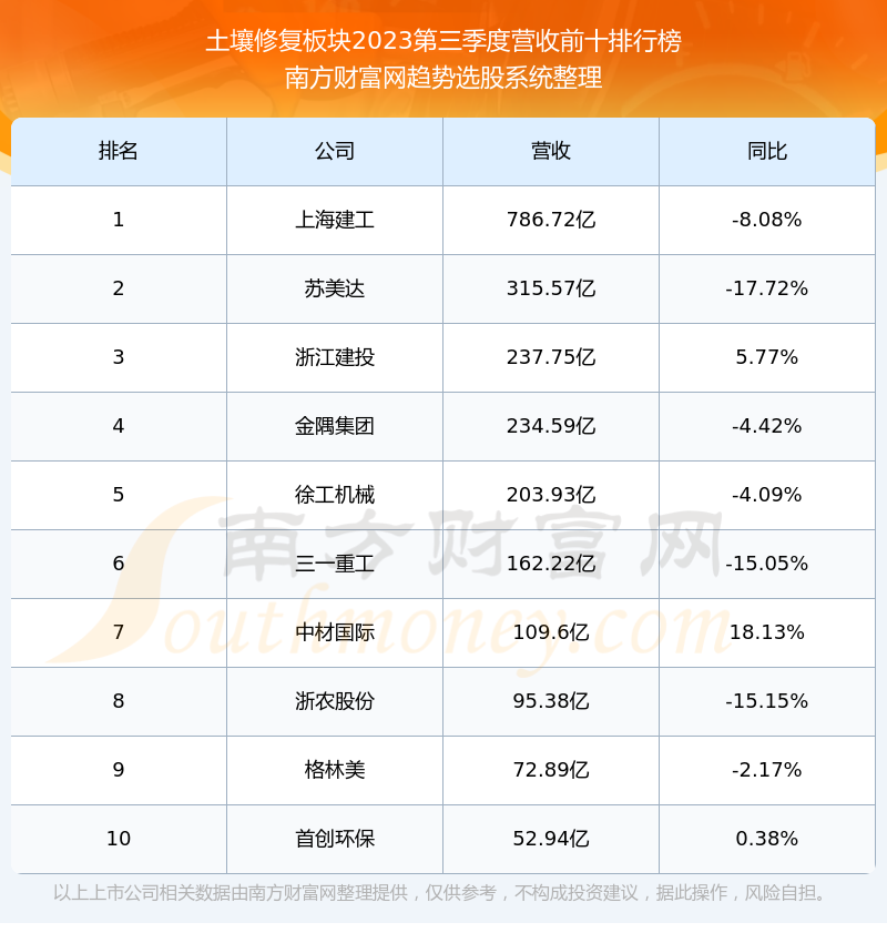 按照南方财富网趋势选股系统统计,该股所属板块为土壤修复板块,该板块共有77只股票,森特股份2023第三季度营收在该板块中排名为第31名,该板块2023第三季度营收排名前十的股票如下表: