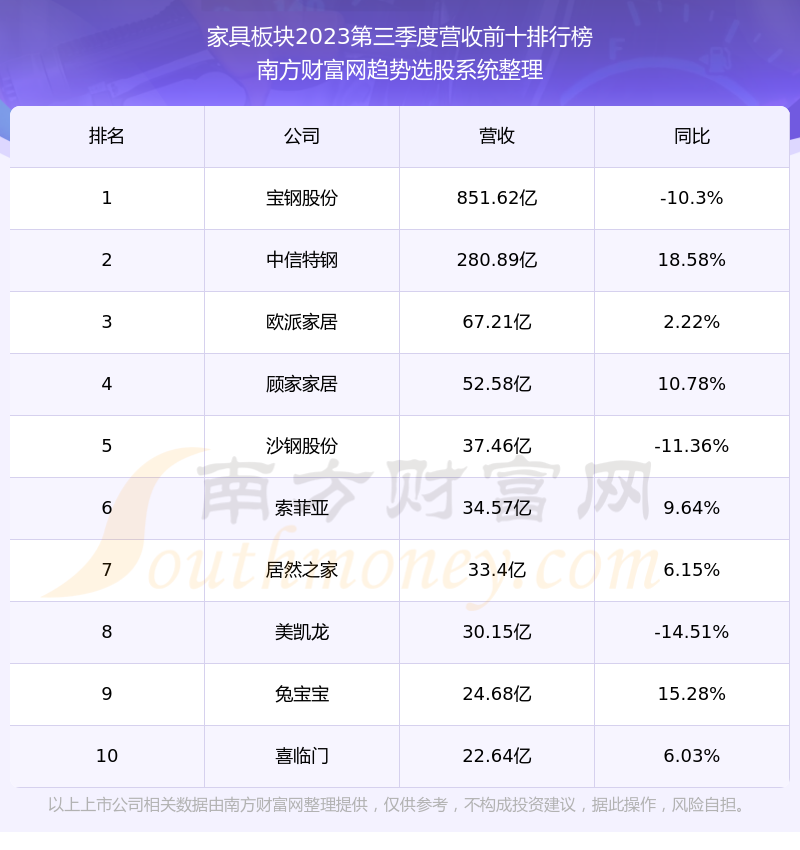 按照南方财富网趋势选股系统统计,该股所属板块为家具板块,该板块共有54只股票,曲美家居2023第三季度营收在该板块中排名为第24名,该板块2023第三季度营收排名前十的股票如下表: