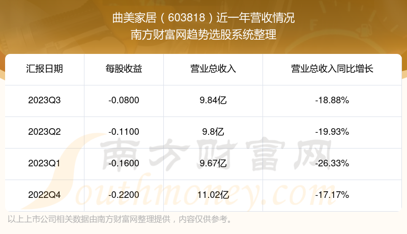曲美家居2023年第三季度显示,公司主营收入9.84亿元,同比-18.88%;归母净利润-4936.93万元,同比-242%;扣非净利润-6370.72万元,同比-274.79%。
