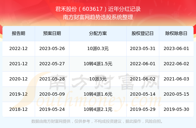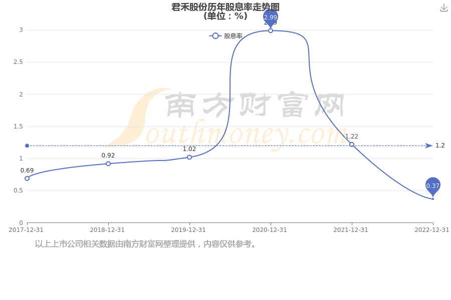 君禾股份最新一次公布的分红方案:10派0.3元。
