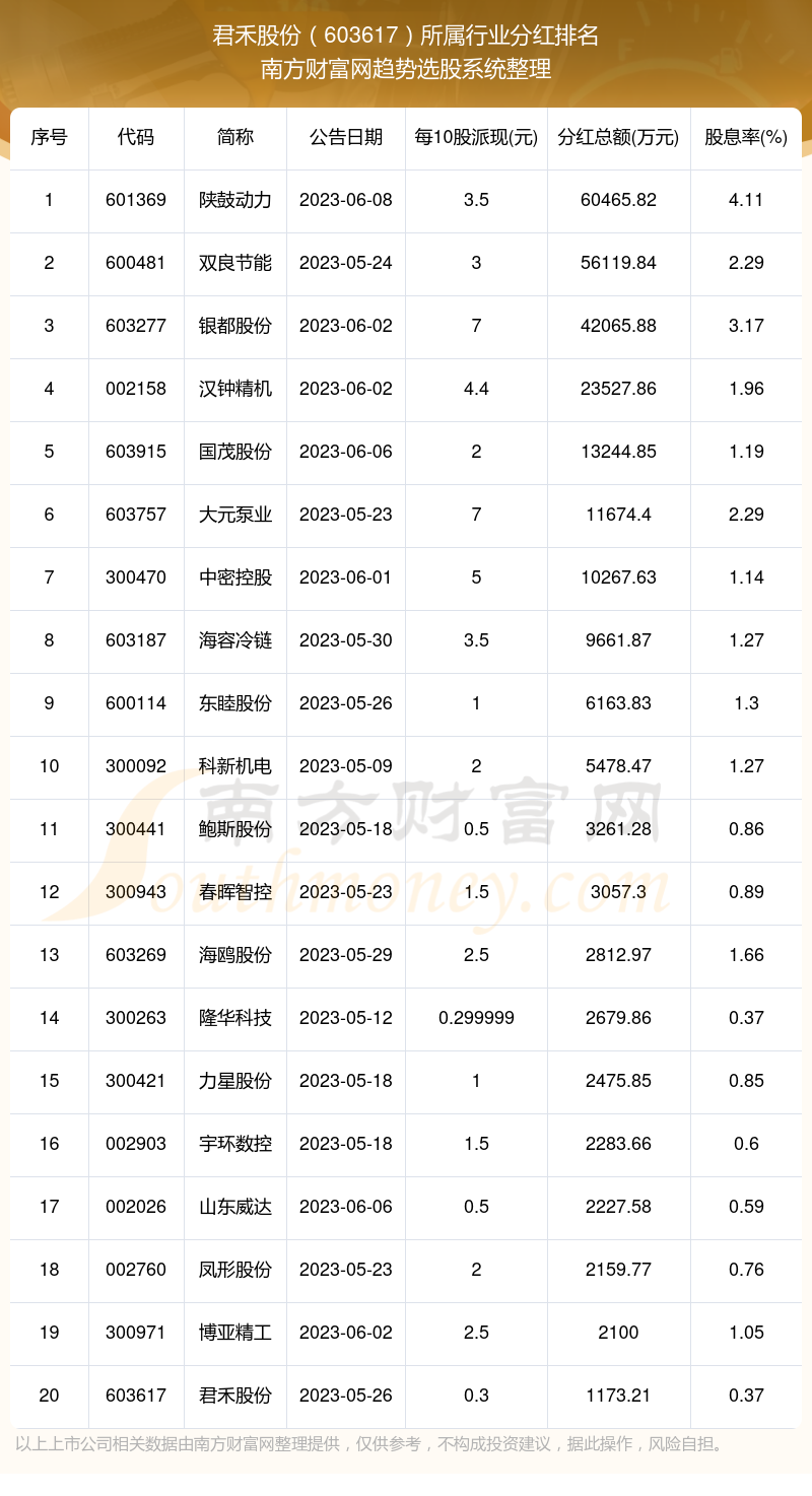 按照南方财富网趋势选股系统统计,君禾股份所属行业为泵行业,泵行业分红排名情况如下表: