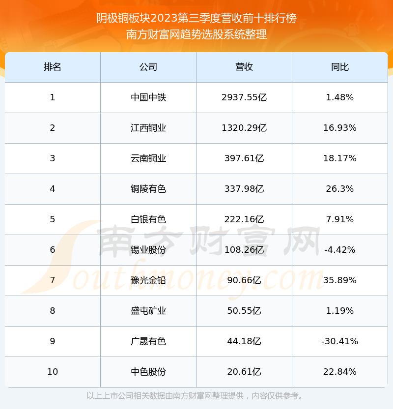 按照南方财富网趋势选股系统统计,该股所属板块为阴极铜板块,该板块共有12只股票,江西铜业2023第三季度营收在该板块中排名为第2名,该板块2023第三季度营收排名前十的股票如下表: