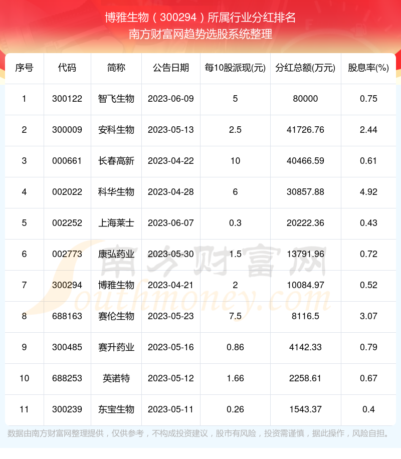 二、博雅生物300294行业分红排名