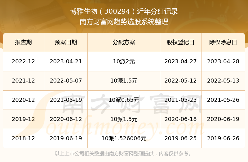 博雅生物最新一次公布的分红方案为10派2元。本次权益分派股权登记日为2023年4月27日,除权除息日为2023年4月28日,派息日为2023年4月28日。