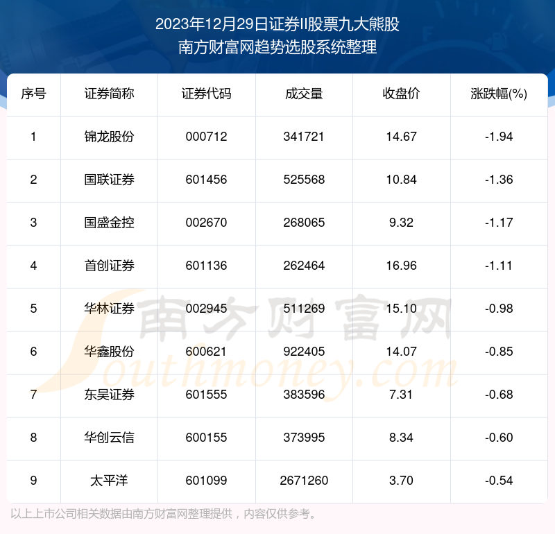 截止2023年12月29日,个股表现方面,证券II股票当日领跌股为锦龙股份(000712),该股当日报收14.67,上涨-1.94%,成交量34.17万。国联证券(601456)以下跌-1.36%紧随其后,该股当日成交量52.56万。此外,国盛金控(002670)、首创证券(601136)、华林证券(002945)均进入当日证券II股票熊股之列。