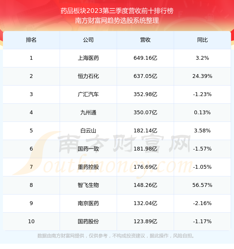 按照南方财富网趋势选股系统统计,该股所属板块为药品板块,该板块共有361只股票,金种子酒2023第三季度营收在该板块中排名为第361名,该板块2023第三季度营收排名前十的股票如下表: