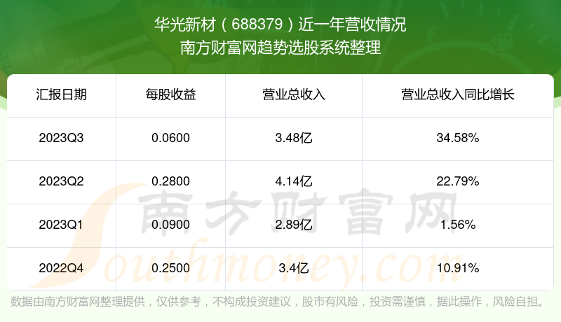 华光新材(688379)披露2023年第三季度报告,报告期实现营收3.48亿元,同比34.58%;归母净利润501.39万元,同比121.84%;扣非净利润359.38万元,同比115.35%;基本每股收益0.06元。