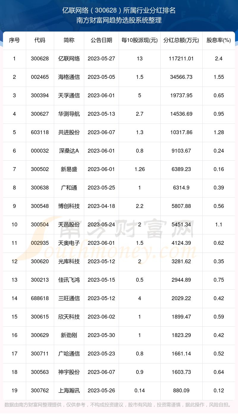按照南方财富网趋势选股系统统计,亿联网络所属行业为通信设备行业,通信设备行业分红排名情况如下表: