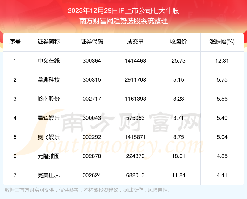 截止2023年12月29日,个股表现方面,IP上市公司当日领涨股为中文在线(300364),该股当日报收25.73,上涨12.31%,成交量141.45万。掌趣科技(300315)以上涨5.75%紧随其后,该股当日成交量291.17万。此外,岭南股份(002717)、星辉娱乐(300043)、奥飞娱乐(002292)均进入当日IP上市公司牛股之列。