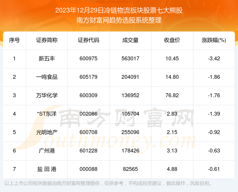 截止2023年12月29日,个股表现方面,冷链物流板块股票当日领跌股为新五丰(600975),该股当日报收10.45,上涨-3.42%,成交量56.3万。一鸣食品(605179)以下跌-1.86%紧随其后,该股当日成交量20.41万。此外,万华化学(600309)、*ST东洋(002086)、光明地产(600708)均进入当日冷链物流板块股票熊股之列。