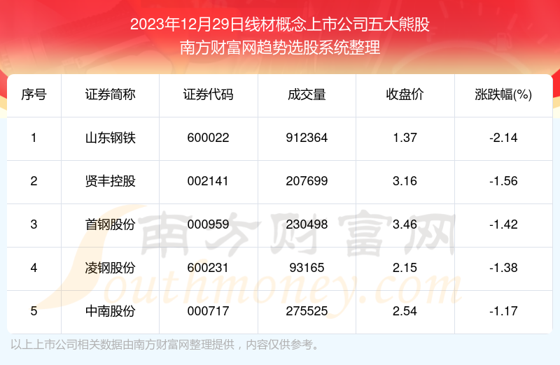 截止2023年12月29日,个股表现方面,线材概念上市公司当日领跌股为山东钢铁(600022),该股当日报收1.37,上涨-2.14%,成交量91.24万。贤丰控股(002141)以下跌-1.56%紧随其后,该股当日成交量20.77万。此外,首钢股份(000959)、凌钢股份(600231)、中南股份(000717)均进入当日线材概念上市公司熊股之列。
