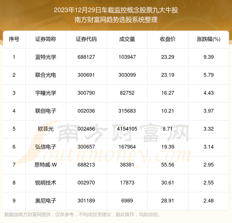 截止2023年12月29日,个股表现方面,车载监控概念股票当日领涨股为蓝特光学(688127),该股当日报收23.29,上涨9.39%,成交量10.39万。联合光电(300691)以上涨5.79%紧随其后,该股当日成交量30.31万。此外,宇瞳光学(300790)、联创电子(002036)、欧菲光(002456)均进入当日车载监控概念股票牛股之列。