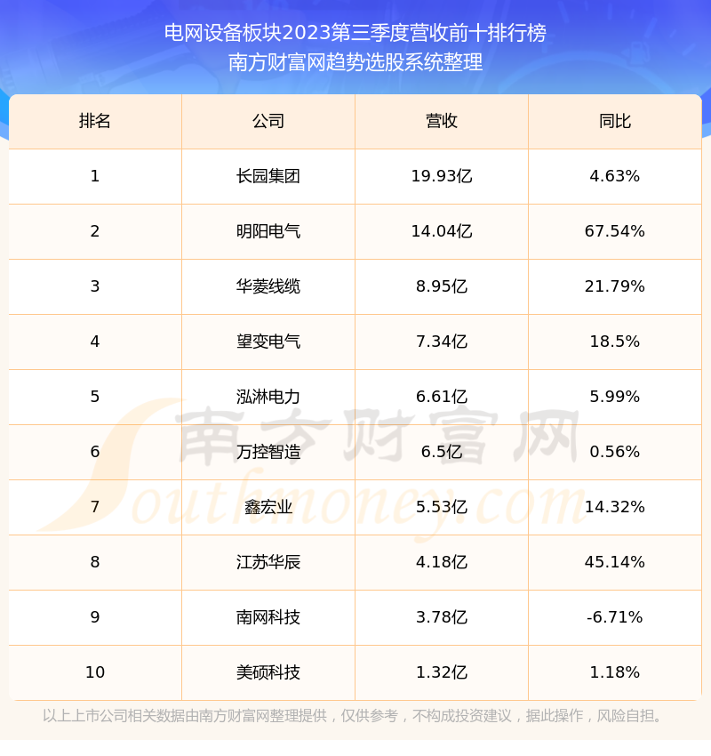 按照南方财富网趋势选股系统统计,该股所属板块为电网设备板块,该板块共有14只股票,泰豪科技2023第三季度营收在该板块中排名为第14名,该板块2023第三季度营收排名前十的股票如下表: