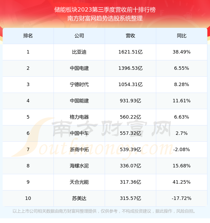 按照南方财富网趋势选股系统统计,该股所属板块为储能板块,该板块共有407只股票,安孚科技2023第三季度营收在该板块中排名为第175名,该板块2023第三季度营收排名前十的股票如下表: