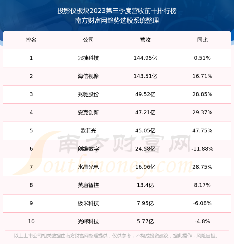 按照南方财富网趋势选股系统统计,该股所属板块为投影仪板块,该板块共有14只股票,极米科技2023第三季度营收在该板块中排名为第9名,该板块2023第三季度营收排名前十的股票如下表: