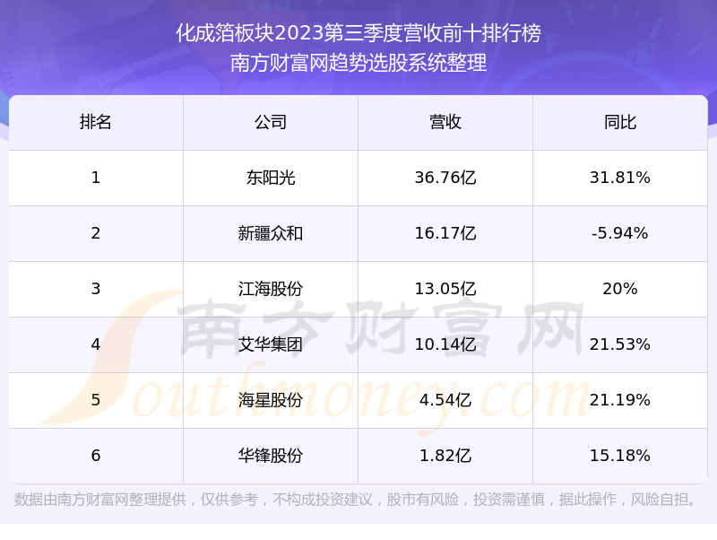 按照南方财富网趋势选股系统统计,该股所属板块为化成箔板块,该板块共有6只股票,海星股份2023第三季度营收在该板块中排名为第5名,该板块2023第三季度营收排名前十的股票如下表: