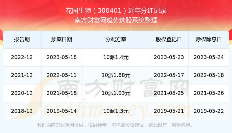 花园生物最新一次公布的分红方案为10派1.4元。本次权益分派股权登记日为2023年5月23日,除权除息日为2023年5月24日,派息日为2023年5月24日。