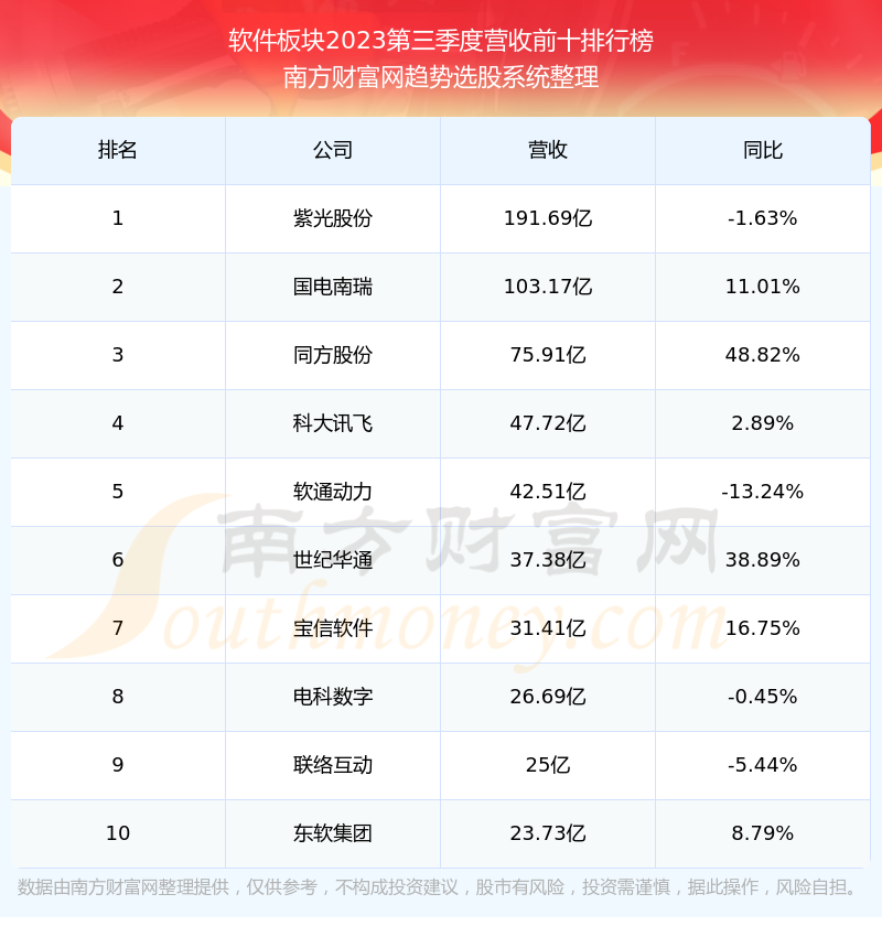按照南方财富网趋势选股系统统计,该股所属板块为软件板块,该板块共有250只股票,山石网科2023第三季度营收在该板块中排名为第115名,该板块2023第三季度营收排名前十的股票如下表: