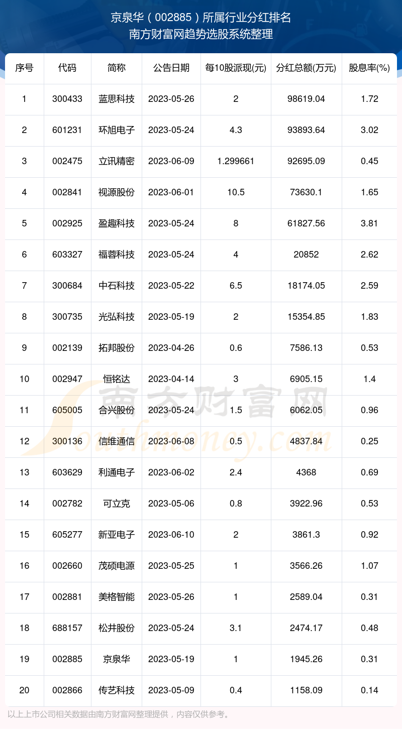 按照南方财富网趋势选股系统统计,京泉华所属行业为特种变压器行业,特种变压器行业分红排名情况如下表:
