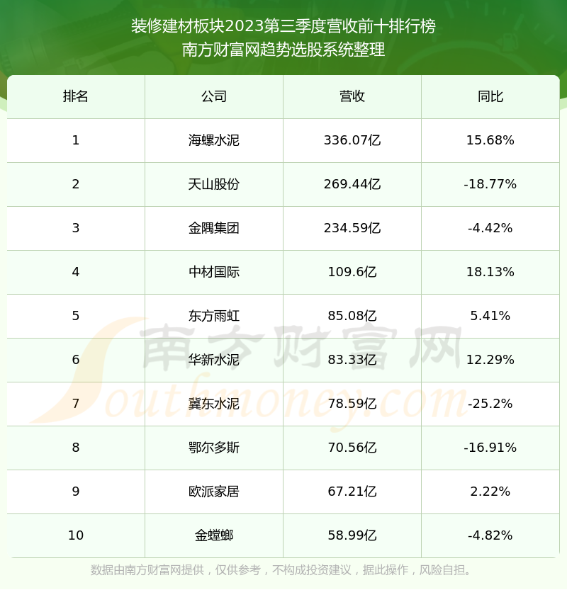 按照南方财富网趋势选股系统统计,该股所属板块为装修建材板块,该板块共有82只股票,美克家居2023第三季度营收在该板块中排名为第82名,该板块2023第三季度营收排名前十的股票如下表: