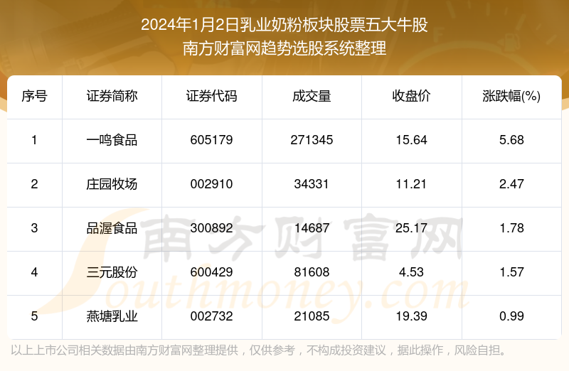 截止2024年1月2日,个股表现方面,乳业奶粉板块股票当日领涨股为一鸣食品(605179),该股当日报收15.64,上涨5.68%,成交量27.13万。庄园牧场(002910)以上涨2.47%紧随其后,该股当日成交量3.43万。此外,品渥食品(300892)、三元股份(600429)、燕塘乳业(002732)均进入当日乳业奶粉板块股票牛股之列。