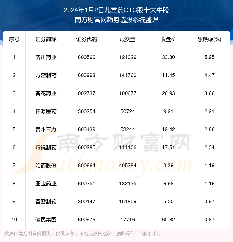 截止2024年1月2日,个股表现方面,儿童药OTC股当日领涨股为济川药业(600566),该股当日报收33.30,上涨5.95%,成交量12.1万。方盛制药(603998)以上涨4.47%紧随其后,该股当日成交量14.18万。此外,葵花药业(002737)、仟源医药(300254)、贵州三力(603439)均进入当日儿童药OTC股牛股之列。