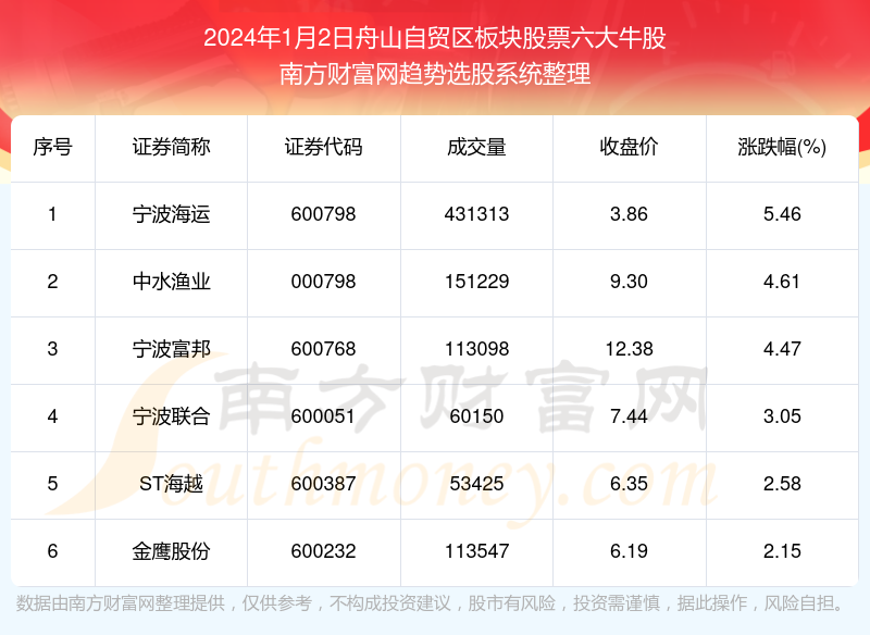 截止2024年1月2日,个股表现方面,舟山自贸区板块股票当日领涨股为宁波海运(600798),该股当日报收3.86,上涨5.46%,成交量43.13万。中水渔业(000798)以上涨4.61%紧随其后,该股当日成交量15.12万。此外,宁波富邦(600768)、宁波联合(600051)、ST海越(600387)均进入当日舟山自贸区板块股票牛股之列。