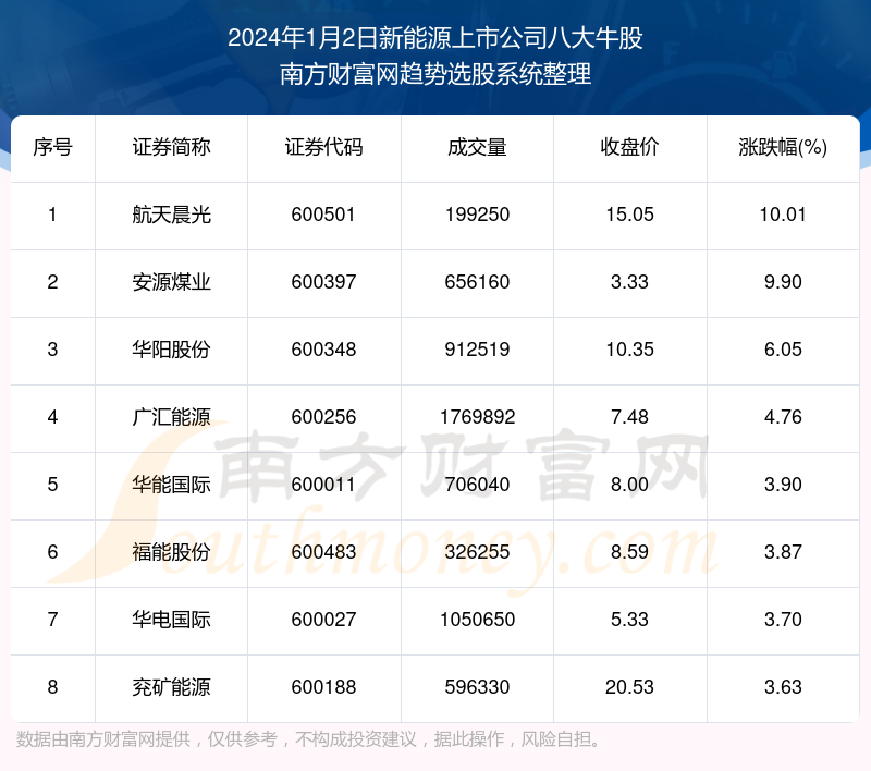截止2024年1月2日,个股表现方面,新能源上市公司当日领涨股为航天晨光(600501),该股当日报收15.05,上涨10.01%,成交量19.93万。安源煤业(600397)以上涨9.90%紧随其后,该股当日成交量65.62万。此外,华阳股份(600348)、广汇能源(600256)、华能国际(600011)均进入当日新能源上市公司牛股之列。
