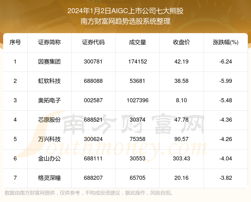 截止2024年1月2日,个股表现方面,AIGC上市公司当日领跌股为因赛集团(300781),该股当日报收42.19,上涨-6.24%,成交量17.42万。虹软科技(688088)以下跌-5.99%紧随其后,该股当日成交量5.37万。此外,奥拓电子(002587)、芯原股份(688521)、万兴科技(300624)均进入当日AIGC上市公司熊股之列。