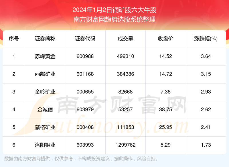截止2024年1月2日,个股表现方面,铜矿股当日领涨股为赤峰黄金(600988),该股当日报收14.52,上涨3.64%,成交量49.93万。西部矿业(601168)以上涨3.15%紧随其后,该股当日成交量38.44万。此外,金岭矿业(000655)、金诚信(603979)、藏格矿业(000408)均进入当日铜矿股牛股之列。