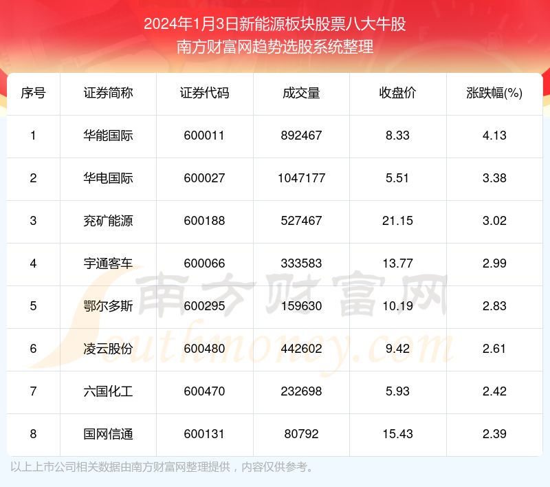 截止2024年1月3日,个股表现方面,新能源板块股票当日领涨股为华能国际(600011),该股当日报收8.33,上涨4.13%,成交量89.25万。华电国际(600027)以上涨3.38%紧随其后,该股当日成交量104.72万。此外,兖矿能源(600188)、宇通客车(600066)、鄂尔多斯(600295)均进入当日新能源板块股票牛股之列。
