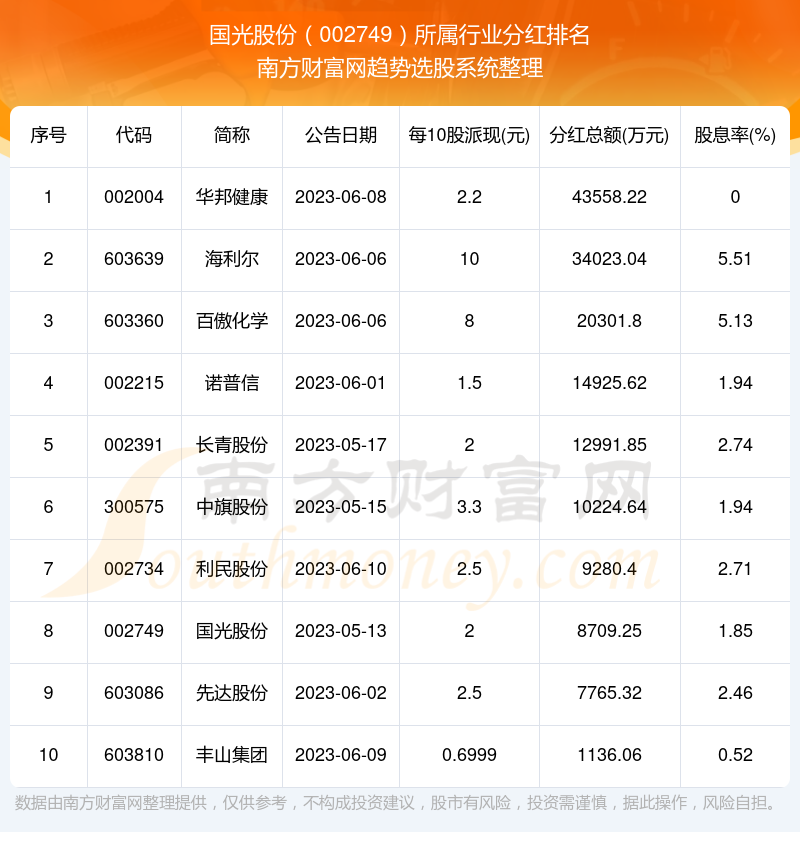 按照南方财富网趋势选股系统统计,国光股份所属行业为农药兽药行业,农药兽药行业分红排名情况如下表: