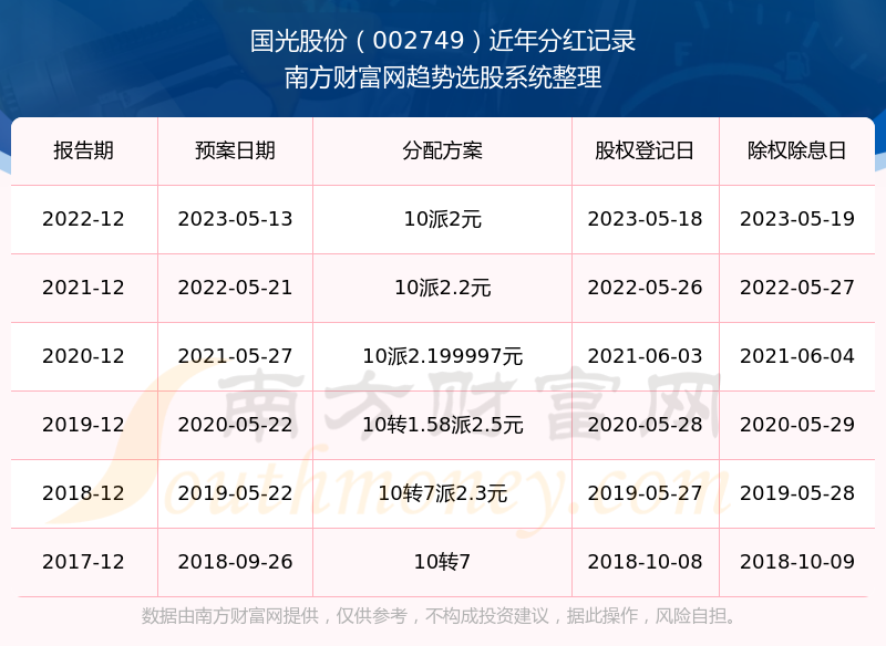 国光股份最新一次公布的分红方案为10派2元。本次权益分派股权登记日为2023年5月18日,除权除息日为2023年5月19日,派息日为2023年5月19日。
