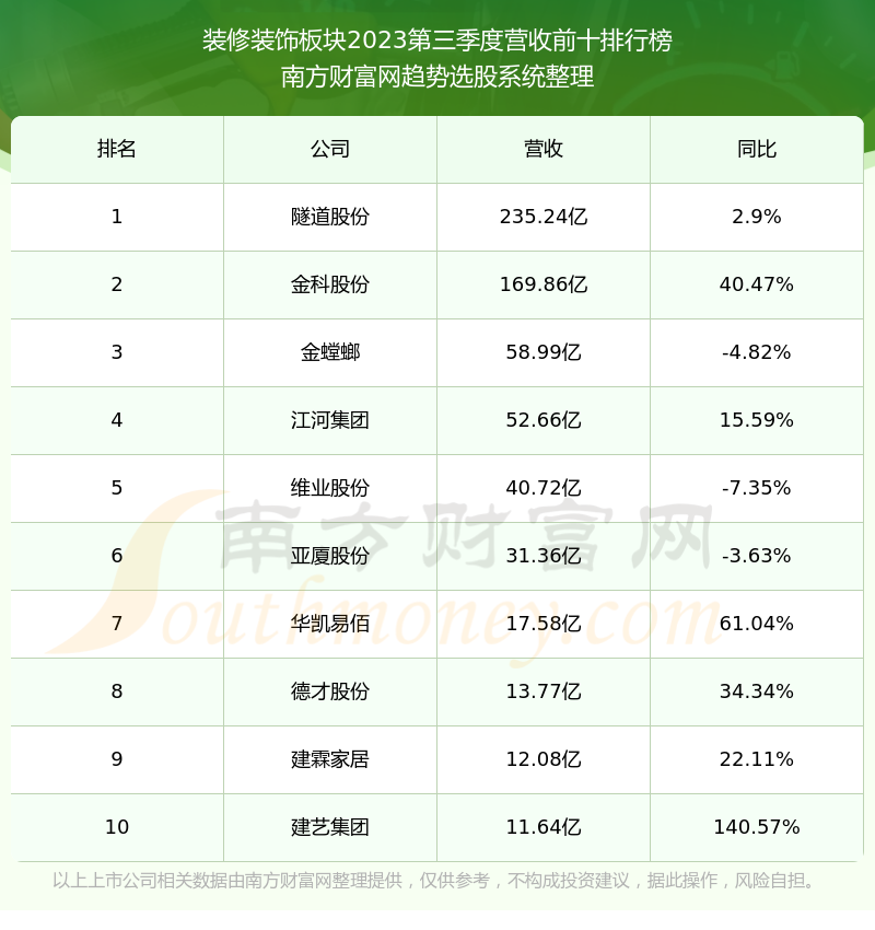 按照南方财富网趋势选股系统统计,该股所属板块为装修装饰板块,该板块共有42只股票,联翔股份2023第三季度营收在该板块中排名为第41名,该板块2023第三季度营收排名前十的股票如下表: